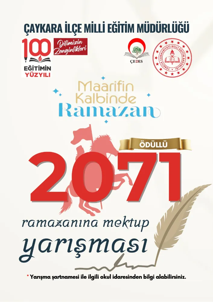 Çaykara İlçe Milli Eğitim Müdürlüğü tarafından ortaokul ve lise öğrencilerine yönelik olarak “2071 Ramazanına Mektup Yarışması” düzenleniyor. Yarışma ile öğrencilerin milli ve manevi değerler ışığında geçmişin birikimini geleceğe taşıması amaçlanıyor.