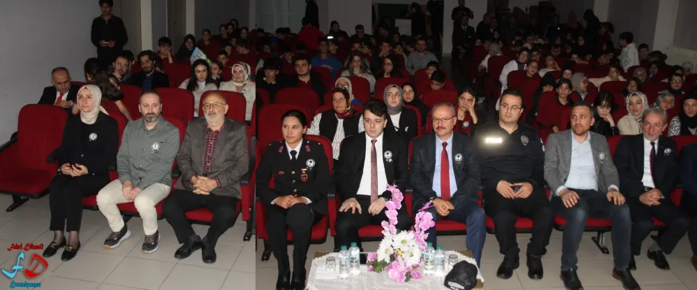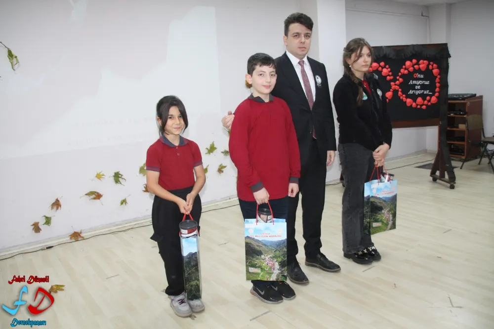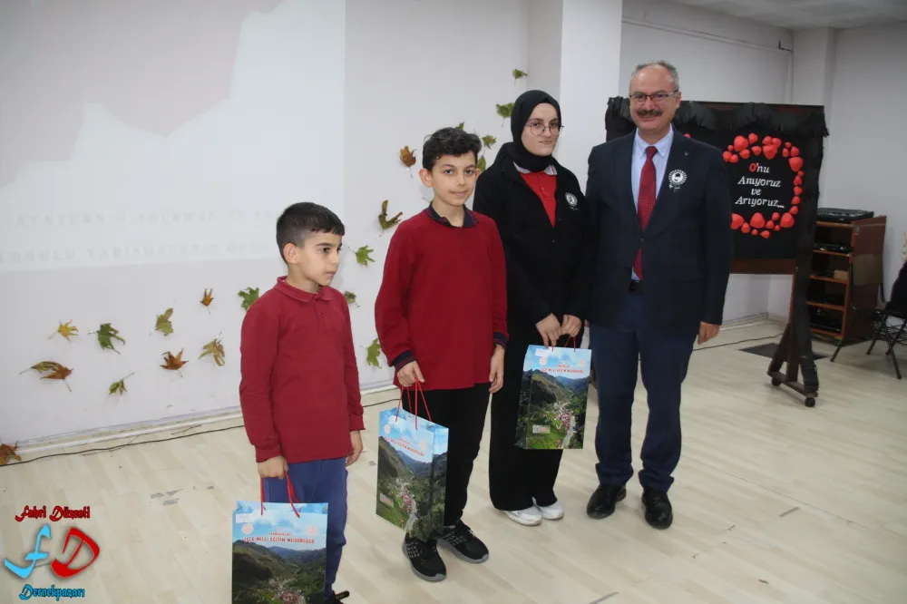 Video sunumu sonunda Atatürk le ilgili yapılan yarışmalarda kazanan öğrenciler, Milli Eğitim Müdürü-Belediye Başkanı ve Kaymakam tarafından ödüllendirildi.