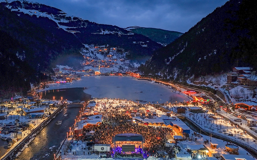 Bu fotoğraf, Uzungöl’ün kış gecesinde attığı kalbin ritmini yukarıdan ve bütün görkemiyle hissettiriyor. Karla örtülü dağların arasında bir mücevher gibi parlayan göl, festival alanından yükselen ışıklar ve kalabalıkla birlikte adeta canlanıyor. Sahnedeki ışıklar, sokaklara yayılan hareket ve binlerce insanın oluşturduğu canlılık; Uzungöl 1. Kış Festivali’nin sadece bir etkinlik değil, ortak bir hafıza anı olduğunu güçlü biçimde anlatıyor. Soğuk kış gecesini sıcacık bir atmosfere dönüştüren bu kare, birlikteliği, coşkuyu ve Uzungöl’ün eşsiz doğasını tek bir bakışta buluşturuyor.