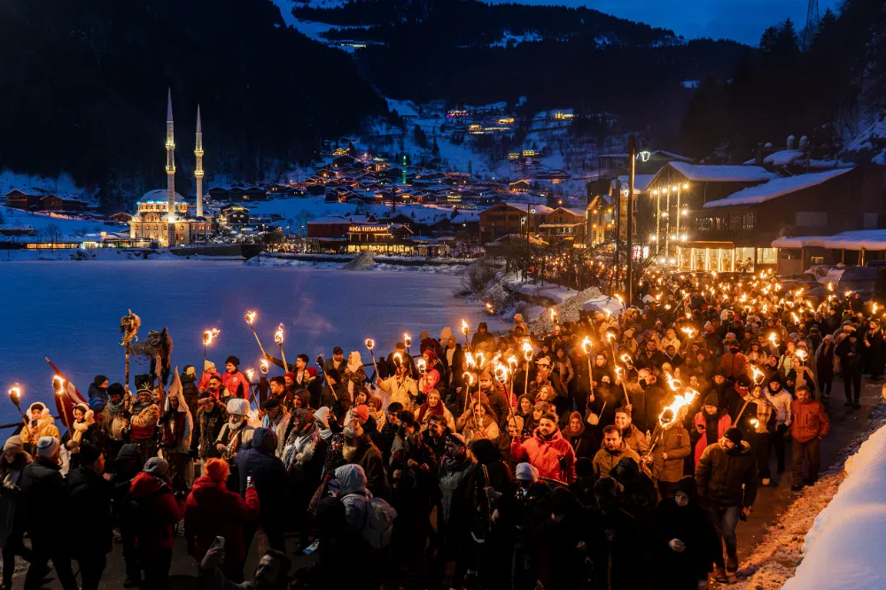 Bu fotoğraf, Uzungöl’ün kış gecesinde yüzyılların geleneğini bugünün coşkusuyla buluşturan güçlü bir hafıza karesi. Kalandar kutlaması kapsamında düzenlenen meşaleli kortej yürüyüşü, karanlığı yaran alevlerle sadece yolu değil, ortak bir kültürü de aydınlatıyor. Donmuş gölün kıyısında uzanan insan seli, meşalelerin sıcak ışığıyla birlikte birlik, dayanışma ve aidiyet duygusunu gözler önüne seriyor. Arka planda yükselen Uzungöl silueti ve caminin minareleri, bu yürüyüşe manevi ve tarihsel bir derinlik katarken; fotoğraf, geleneğin hâlâ canlı, hâlâ güçlü olduğunu sessiz ama etkileyici bir dille anlatıyor.