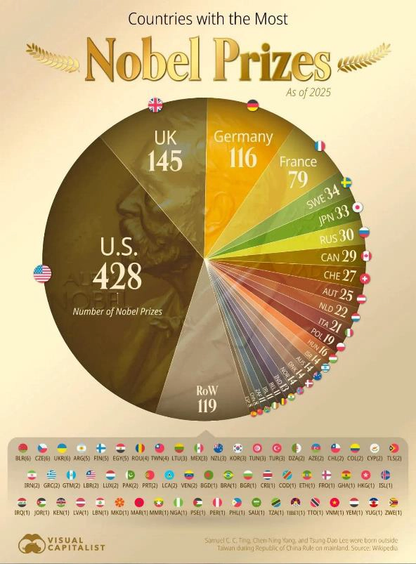 2025 yılı itibarıyla dünyadaki Nobel Ödülü alan ülkelerin nobel sayıları Şekil-1’de gösterilmiştir. 2025 yılına göre 428 Nobel Ödülünü ABD, 145’ini İngiltere ve 116’sını Almanya kazanmıştır. Fransa ise 79 ödülle 4. sırada yer almaktadır. Bu tablo da bilim ve teknoloji yarışında önde olan ülkeleri açıkça göstermektedir. 2025 yılına kadar 1026 Nobel ödülü verilmiş, bunlardan 3 tanesi Türkiyedendir.Bunlar Orhan Pamuk (2006),Aziz Sancar (2015) ve Daron Acemoğlu (2024)’dur.